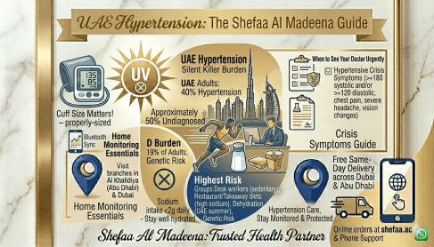 Blood pressure monitors, replacement cuffs, and a full range of cardiovascular health supplements are available at all Shefaa Al Madeena branches and online at shefaa.ae. Call +971-54-279-7001 or message on WhatsApp for product advice before visiting.