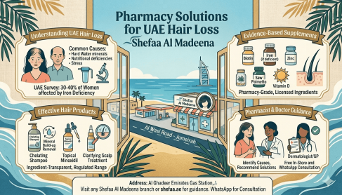 A licensed pharmacy can genuinely help with hair health — through the right supplements, pharmacy-grade topical treatments, and pharmacist advice that connects your symptoms to likely causes. This article covers what is actually driving hair loss for many UAE residents and what works based on evidence, not marketing.