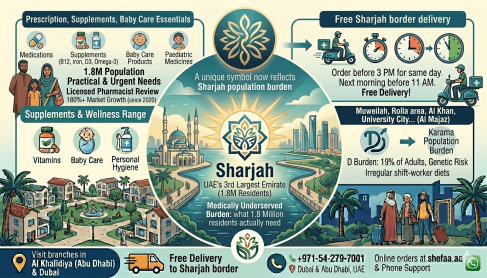 Sharjah residents frequently cross the Dubai border to pick up specific vitamins, imported skincare brands not stocked in local pharmacies, or to get a prescription filled at a pharmacy they trust. This is a real pattern — and it represents a service gap that should not exist in a city of this size.