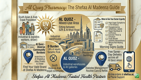 Shefaa Al Madeena Pharmacy serves the Al Quoz community through its nearby branches and through free home delivery across all Al Quoz sub-areas — Al Quoz 1, 2, 3, and 4, as well as Al Quoz Industrial areas. If you cannot make it to a branch, your medicine, vitamins, or health products come to you.