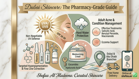 Shefaa Al Madeena Pharmacy carries a curated skincare range across its Beauty and Beauty Skin Care categories, available online at shefaa.ae and at branches across Dubai and Abu Dhabi. This article explains what UAE skin challenges look like and how pharmacy skincare addresses them better than most alternatives.