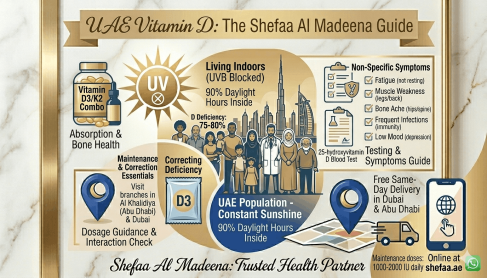 Vitamin D3 and D3/K2 combination supplements are available at all Shefaa Al Madeena branches and through shefaa.ae online with free delivery across Dubai and Abu Dhabi. The pharmacy team can advise on dosage, brand quality, and whether your current medications have any interactions with Vitamin D supplementation — particularly if you are on blood thinners or calcium-containing medications.