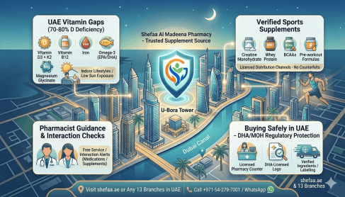 Shefaa Al Madeena carries a full range of vitamins, minerals, and sports supplements on its website at shefaa.ae and across all 13 branches. If you are not sure which product or dosage is right for you, the pharmacy team can give you guidance based on your health situation — no appointment needed.